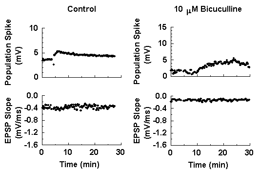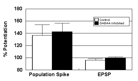 Long-term potentiation (LTP) of the population spike in excess of that predicted by increase in the slope of the field excitatory post-synaptic potential (EPSP) has been described as a component of theta-burst LTP (Exp Brain Res 79:633-641). An increase in the ratio of excitation to inhibition, a reduction of tonic inhibition, and a decrease in spike threshold are thought to contribute to this EPSP-to-spike (E-S) potentiation. Associative LTP using antidromic stimulation as the conditioning stimulus produces a novel kind of E-S potentiation: a stable increase in the population spike amplitude, but no change in the slope of the EPSP (Soc Neuro Abstr 17:533.15). Do changes in GABA mediated synaptic inhibition underlie the associative form of E-S potentiation as they are thought to do in theta-burst E-S potentiation?