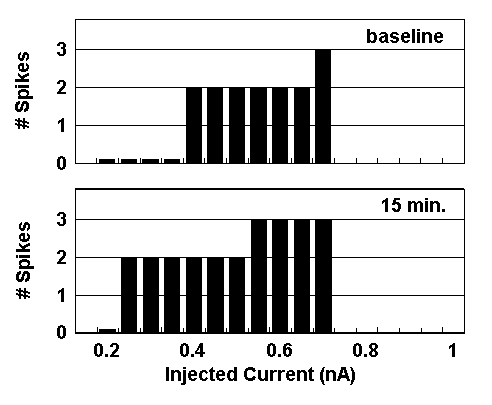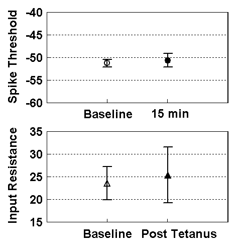 Intracellular recordings from the CA1 layer reveal an increase in excitability following associative E-S potentiation. Paired t-tests suggest that a depolarization of the resting membrane potential (RMP) accounts for the increased excitability (baseline -63.8 ñ 0.8 mV, 15 min. post tetanus -61.2 mV ñ 1.1; mean RMP ñ s.e.m, P = 0.04, F1 = 9.08). Spike threshold, input resistance, and time constant of the membrane were not statistically affected by associative E-S potentiation.