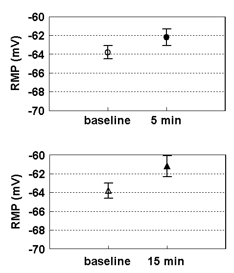 | n | RMP (mV) mean ± s.e.m | T | P | ||